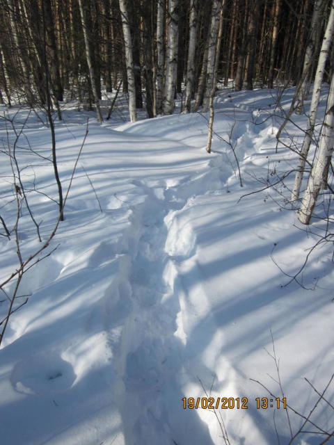 При проведении практической части я совершила один выезд в лес. Работа проводилась 19 февраля 2012 года с 12.00 до 15.00 часов дня. Мы с папой наблюдали и фотографировали следы нескольких зверей, а также подкормочную площадку для кабанов и нору бобра. Папа научил определять свежесть следов и распознавать следы зверей. Для этого нужно знать, как выглядит след зверя - отпечаток, длину, ширину, ход в беге, прыжками.