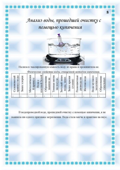 Вывод. В водопроводной воде, прошедшей очистку с помощью кипячения, я не выявила ни одного признака загрязнения. Вода стала мягче и приятнее на вкус.