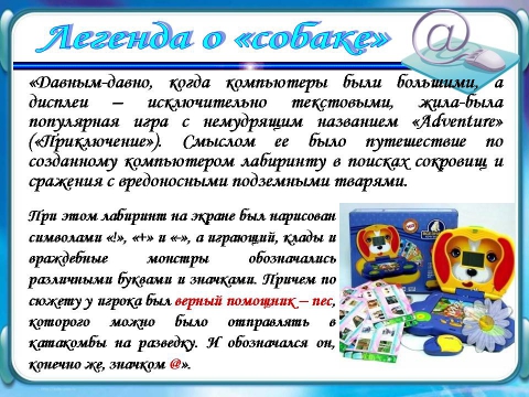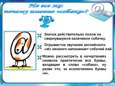 История «собаки» уходит корнями еще в 1971 год. Программист Рей Томлинсон работал над программой для обмена электронными сообщениями и он впервые использовал значок «@», т.к. этот символ не встречался в английских именах и фамилиях. Так «собачка» мирно дожидалась своего звёздного часа!