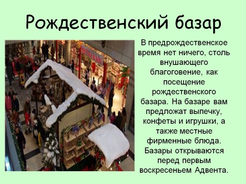 Экспертная оценка что это? РОЖДЕСТВО как в Германии, так и в России тесно связан с обычаями и нравами. Этот праздник играет большую роль в жизни людей. Изучая и исследуя тему " Празднование Рождества в Германии и России, мы много работали в сети Интернет, находили необходимую информацию о праздновании праздника, что есть общего и какие различия, изучили необходимую литературу, провели анкетирование, опросы одноклассников и жителей села. Особенно нам понравилось собирать кулинарные рецепты, песни, колядки,изображения рождественских атрибутов в Германии. Всё это проанализировали и у нас сложилась полная картина. РОЖДЕСТВО - самый волшебный и любимый праздник, которого ждут с большим интересом как взрослые так и дети. РОЖДЕСТВО - это праздник Христа.На Рождество украшают рождественскую ёлку, зажигают свечи, поют рождественские песни, раздают подарки. Для детей РОЖДЕСТВО - самый важный праздник года, прежде всего из-за подарков. И приносит их ДЕД МОРОЗ с белой бородой и в красном пальто с капюшоном в мешке за плечами, а подарки, как и у нас, дети находят под ёлкой.