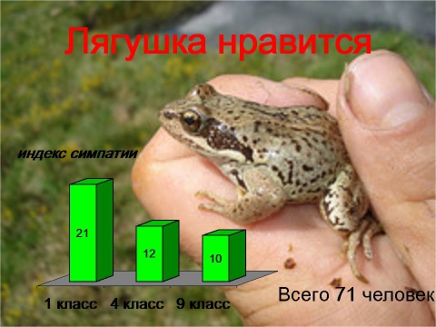 Чтобы выяснить, какими знаниями обладают ученики, я провела опросы и викторину среди учеников разных классов – первого, четвёртого (своего) и девятого. Результаты оформила с помощью диаграмм. А чтобы выяснить отношение к лягушкам – определила индекс симпатии.