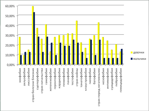 Наиболее актуальным страхом в обследуемой выборке является страх болезни близких - у девочек 59,3%, у мальчиков – 53,1% . Наименее актуальным у девочек является страх темноты – ахлуофобия (9,3%), у мальчиков: клаустрофобия – 6,3%, нозофобия – 6,3%, суицидофобия – 6,3%, пейрафобия – 6,3%.