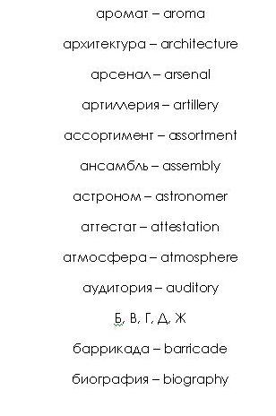 Исходя из цели исследования, нам интересны были, прежде всего, те заимствованные слова, которые входят в школьную программу в качестве словарных. Я начала с того, что выписала все словарные слова с 5 - 10 класс. Потом стала работать с англо-русским словарем. В нем я искала такие слова, которые пишутся в русском языке так, как звучат в английском, ведь в английском языке нет редукций. Затем я сгруппировала их по алфавиту. Самое большое количество слов у меня получилось на букву к, а самое меленькое — на у, ф, х, ц (см. приложения к работе «Словарь»).