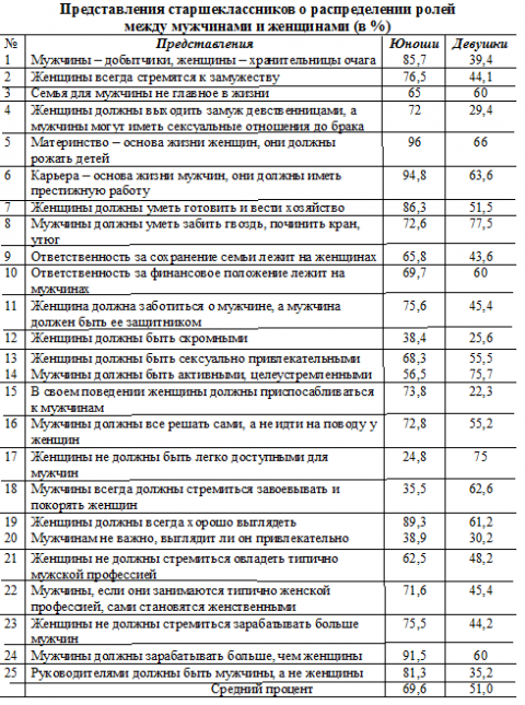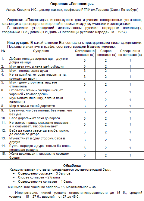 По запросам респондентов обработанные результаты предоставлялись и комментировались в индивидуальной беседе. Для проверки гипотез были использованы методики: Опросник 1 «Представление молодёжи о распределении ролей между мужчинами и женщинами»разработанный сотрудниками Московского Центра гендерных исследований (О.А.Ворониной, Е.Г. Луковицкой, А.В. Емельяненковой); Опросник 2 «Пословицы», разработанный Клециной И.С., доктором психологических наук, профессором РГПУ им.Герцена (Санкт-Петербург). Цель опросника: изучение полоролевых установок, касающихся распределения ролей в семье между мужчинами и женщинами.