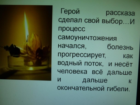 В результате своего исследования я пришла к выводу, что основной составляющей такого противостояния является профилактическая работа. Надо внушить подросткам мысль о пагубности наркотиков. Необходимо предоставить детям и подросткам материалы, из которых они могут узнать, каким потенциальным рискам себя подвергают и как предотвратить зависимость. И таким убедительным материалом, по-моему мнению, может служить рассказ М.Булгакова «Морфий».
